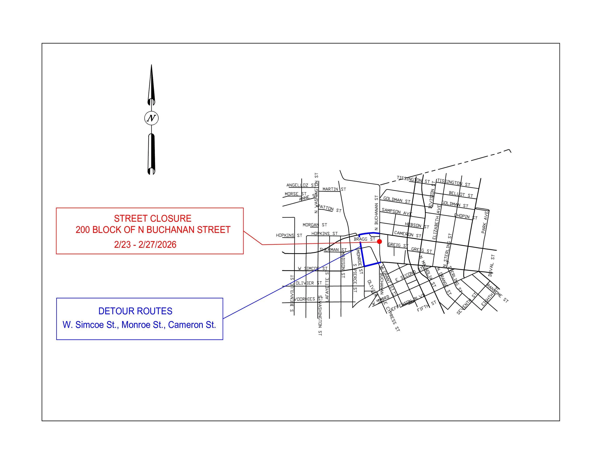According to Lafayette Consolidated Government (LCG), the 200 block of N. Buchanan Street will be closed to vehicular traffic beginning Monday, February 23, through Friday, February 27, 2026.